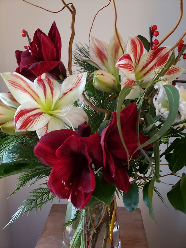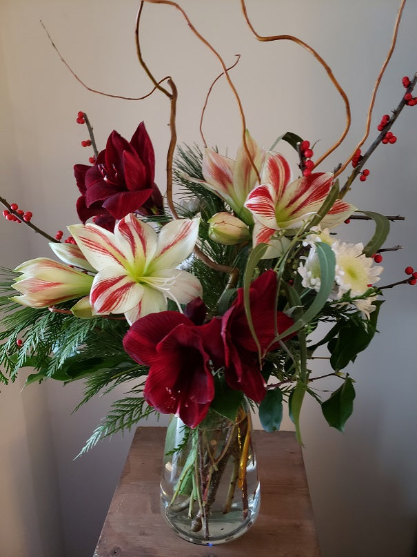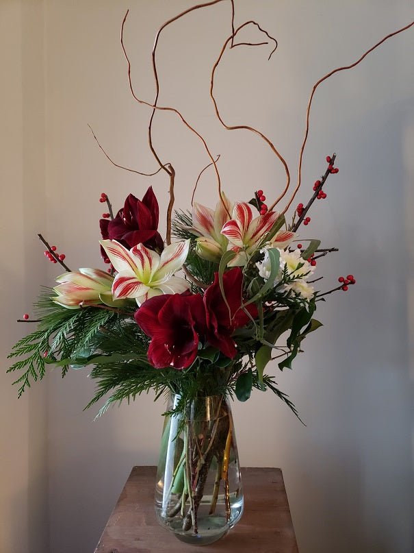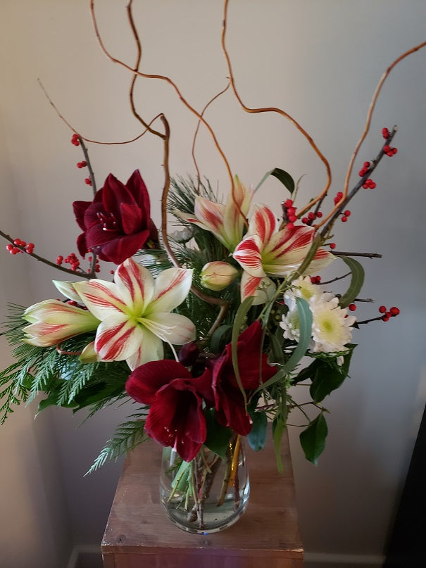 Amaryllis, ilex holly berries, curly willow, greenery and filler flowers.